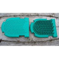 A brush & curry all in one! PVC/rubber bristles on one side for scrubbing and nubby surface for massaging/grooming on the other. Fits average hand.